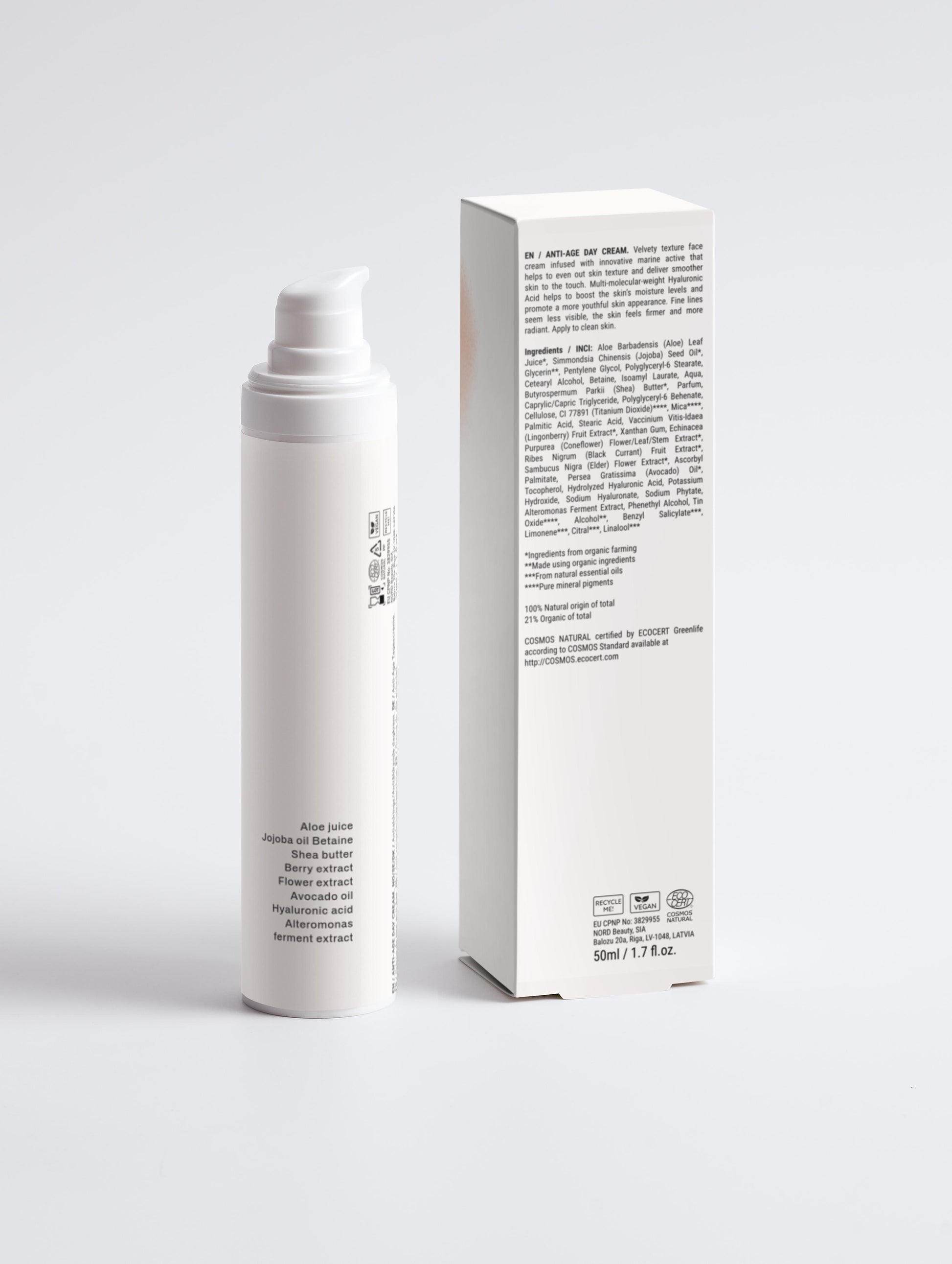 This luxurious face cream combines hyaluronic acid, shea butter, aloe juice, betaine, and marine-derived Alteromonas ferment extract to hydrate, nourish, and improve skin elasticity. Antioxidant-rich berry and flower extracts help protect the skin while enhancing its natural radiance. Ideal for mature skin, it supports a smoother, firmer, and more even complexion. Apply to clean skin as part of your daily anti-age routine.